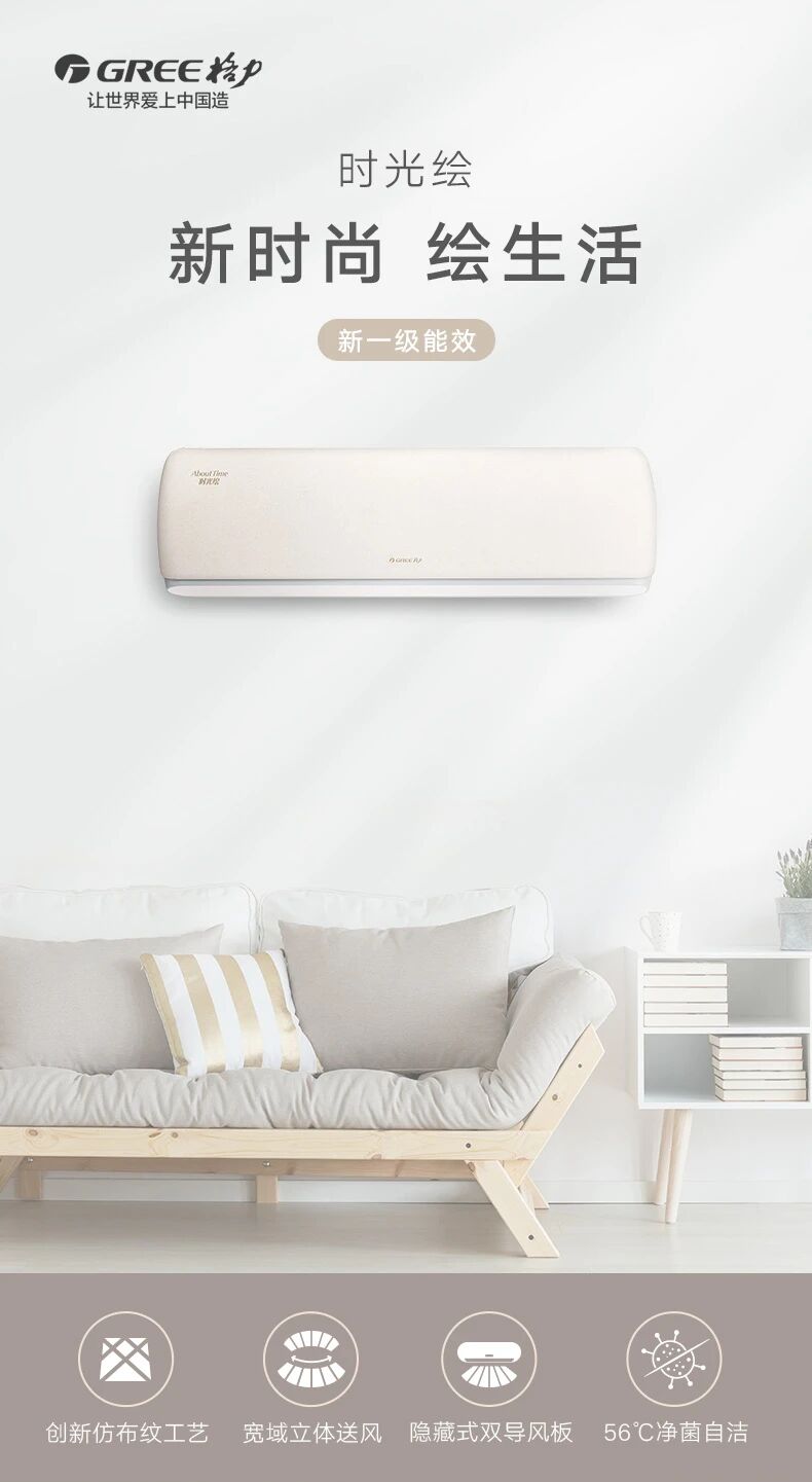 格力时光绘变频1:创新仿布纹工艺,纯净棉麻布纹质感,年轻人的专属文艺空调